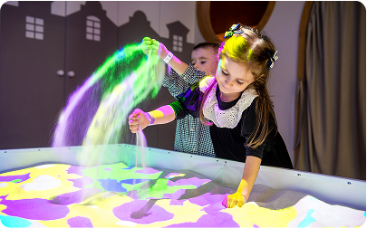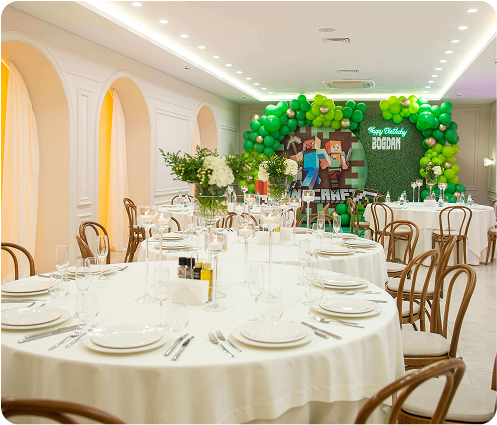 Particularitatea sălii este ieșirea cu vedere spre zona Activity, de unde se deschide o panoramă pitorească asupra spațiului de joacă. Paleta luminoasă a interiorului permite decorarea sălii în orice stil — puteți da viață oricărei idei și crea atmosfera la care visați.
