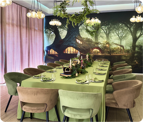 Magic Room — sală primitoare pentru sărbători în cerc restrâns, de până la 30 de oaspeți. Atmosfera magică a unei păduri fermecate, cu o ușoară trimitere la aventurile de basm ale Alisei și Pălărierului Nebun, creează o stare specială. Aici au loc sărbători calde în familie, zile de naștere pentru copii, petreceri tematice pline de culoare și evenimente restrânse, încărcate de magie și bucurie.